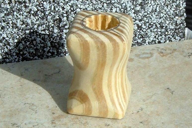 Redrock at TSD inspired this handle. I didn't take pictures from the beginning, but I started with a square blank. After I got the basic shape, I found the center and drilled out most of it (first picture). In the second picture, I have removed most of the wood between the holes with my Dremel. In the third picture, I have made the hole bigger and smooth with my Dremel drum sander. I make it big enough for a nickel. When my knot arrives, I will adjust it to fit. In the other pictures, I am just showing it off. I have sanded it and smoothed it out. I think I am about ready to finish it. I have two black pure badger knots coming. One is going into #11, and I think I will put the other in this one.