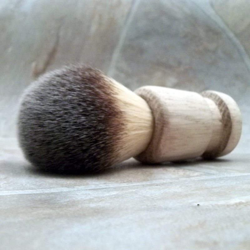 It was a beautiful day today, but we had some scattered rain, so I moved my work beneath the carport. The temperature stayed around 60 degrees so, it was quite pleasant to work. I patterned this brush after a Vie-Long handle. I decided to go with the dark walnut stain which plays well with the Maggard synthetic knot. All that is left at this time is to do the polyurethane and set the knot.
