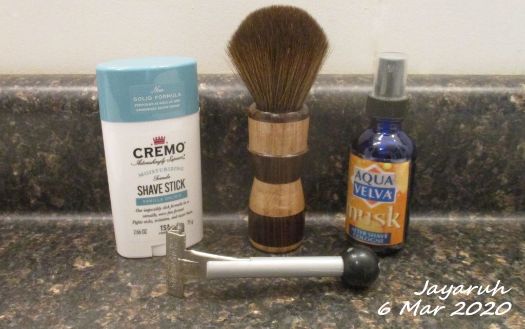 The Cremo Shave Stick face-lathered well with the Jayaruh #387 brush. Two passes and touch ups with the Stick Schick with a Schick Proline blade gave me a close, comfortable shave. After a cold water rinse I finished off with Aqua Velva Musk AS. I am clean, smooth, and refreshed...