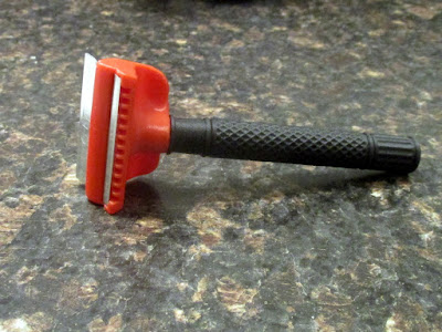 I received this 3-D printed razor from Roger Quintero today. The Raptor SE razor was designed and printed by Roger. It is a fine, crisp, specimen. I look forward to shaving with it tomorrow. The geometry of the head is similar to the Triceratops 3-D printed razor. Roger's innovation here is the support that goes into place as the handle is turned. The support was inspired by the Henckel's Rapide razor.
