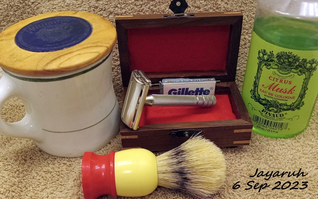 The Williams Mug Shaving Soap lathered well with Ever-Ready C-40 Boar brush. Two passes and touch ups with the No Notch Gillette Super Speed Razor and a Gillette Silver Blue Blade gave me a close, comfortable shave. After a cold water rinse I finished off with Dickinson's Witch Hazel and then Pinaud Citrus Musk EDC. I am clean, smooth, and refreshed...